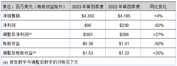 2023年度實(shí)現(xiàn)了創(chuàng)紀(jì)錄的凈銷售額,約為182億美元,較上年增長3%左右。在銷售價格上漲的帶動下,有機(jī)銷售額增長了3%。調(diào)整后每股收益也創(chuàng)下歷史新高,增長了27%,原因包括銷售價格上漲、投入成本下調(diào)、結(jié)構(gòu)性成本節(jié)省和有利的外幣折算,但被銷量下降部分抵消。年末,投入成本和庫存水平仍高于歷史水平。