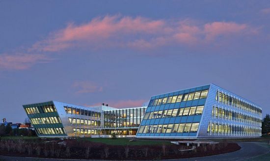 斯文森工程大廈,位于明尼蘇達州德盧斯大學校園北部,是一棟兩層高的綜合性大樓。該建筑結合了教師辦公室、學生工作區、教室及結構和液壓實驗室為一體。斯文森工程大廈位于明尼蘇達州德盧斯大學校園北段,是一棟兩層高的結合教師辦公室,學生工作區,教室和結構和液壓實驗室的綜合性大樓。因為該地區的排水系統與受保護的鱒魚流域相連,所以設計團隊采用透水性地磚鋪裝,并設計有雨水花園和一個地下雨水儲存系統,用來收集與處理90%的降水。此外,幾乎1/4的建筑屋頂表面都被植物所覆蓋。