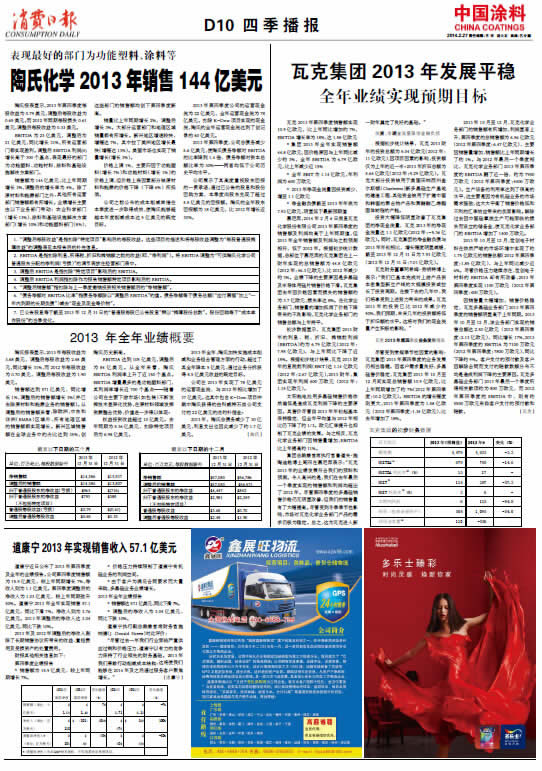 道康寧2013 年實現(xiàn)銷售收入57.1億美元