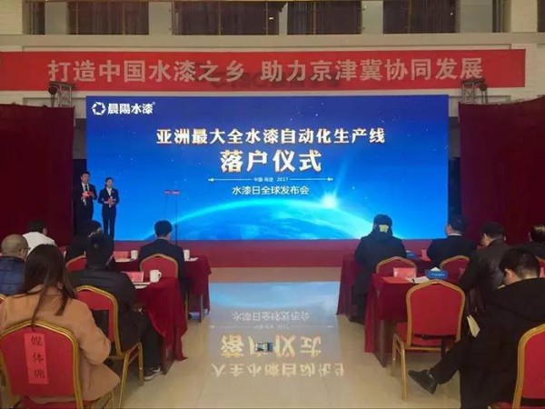 2月17日,“亞洲最大規模全水漆自動化生產線落戶儀式暨水漆日全球發布會”在河北保定舉行。晨陽水漆呼吁公眾健康生活、綠色消費,大力發展水性涂料。